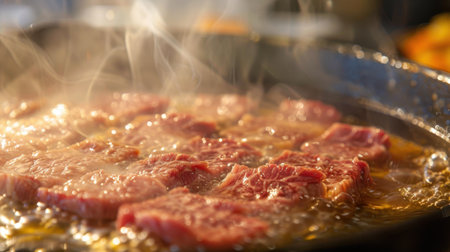 Mouth-watering close-up of diced meat sizzling in a pan, enveloped in fragrant smoke. Perfect for culinary art, food preparation, or gourmet recipes.