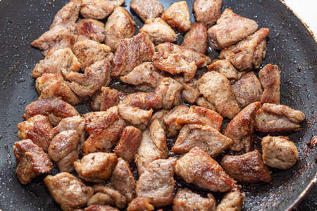 Close up of meat beef cubes chunks in a frying pan. Preparing dinner concept