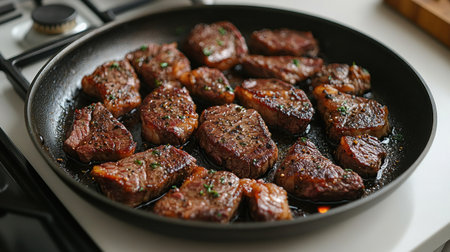 Tender beef cuts browned beautifully on a skillet, filling the air with savory aromas.