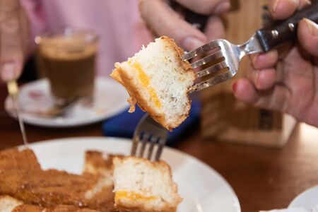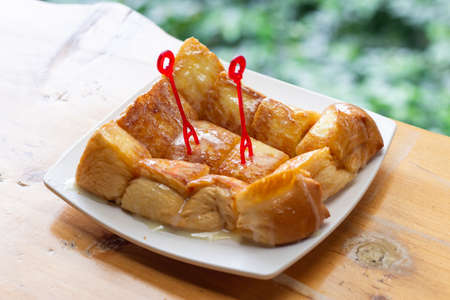 Thai Condensed Milk Toast served on wooden plate on black table.