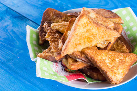 Traditional Spanish dessert Torrijas. Heap of a deep fried sweet bread on a blue plate