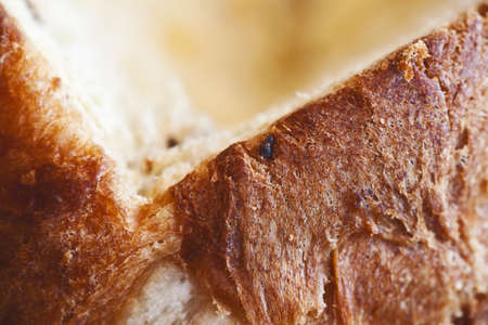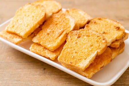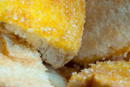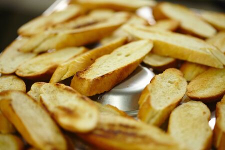 Selective focus on slices of fried white bread close-up. Tasty rosy croutons. Abstract food background.