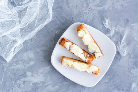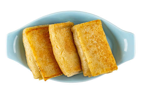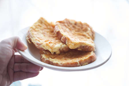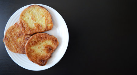 Dairy fried toasts in white glass dish on brown wooden table. Top view
