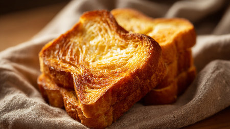 Golden Brown French Toast Slices Arranged on Fabric Surface with Warm Light
