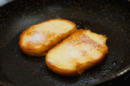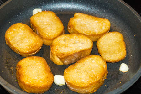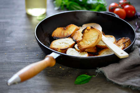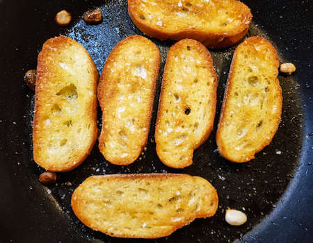 Slices of bread or croutons are toasted in a black pan. High quality photo