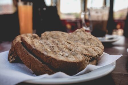 French bread toasted butter on the plate with coffee for breakfast with vintage knife or brunch.