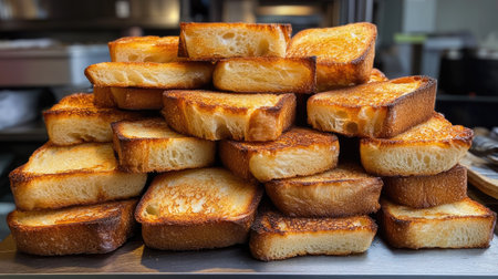 This image features a detailed close-up of neatly stacked slices of golden brown toasted bread, showcasing their crispy texture and inviting aroma. Perfect for food enthusiasts.