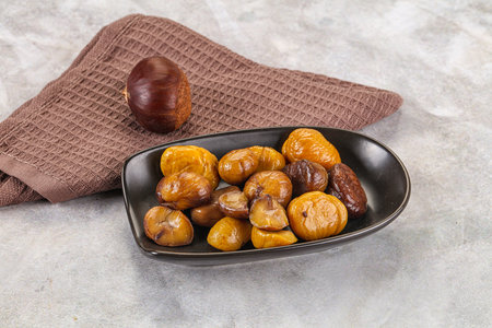 Delicious cut roasted chestnuts with oil and sugar, healthy eating snack in life, close up.