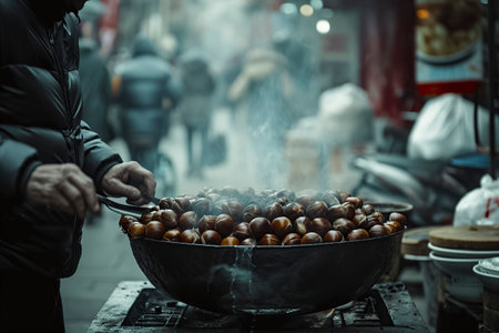 person roasting chestnuts on a busy street, embodying the vibrant culture of street food