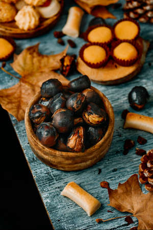 Roasted chestnuts in a small iron pan on a table with autumn leaves and pine cones. Ready to eat. Traditional autumn food.