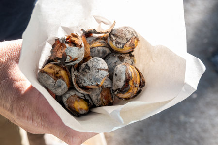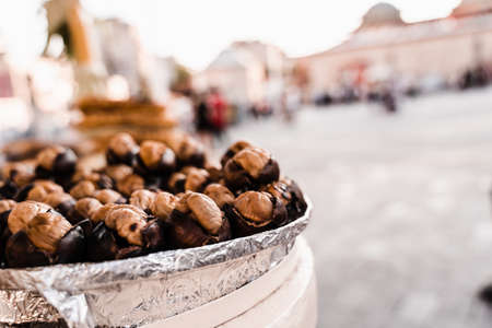Closeup of street food of roasted chestnuts. Traditional authentic street food.