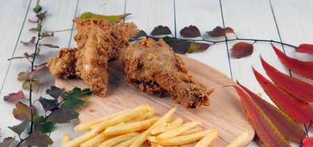 Two breaded chicken wings, one chicken leg and a bunch of golden french fries are on a wooden board with decoration of autumn leaves