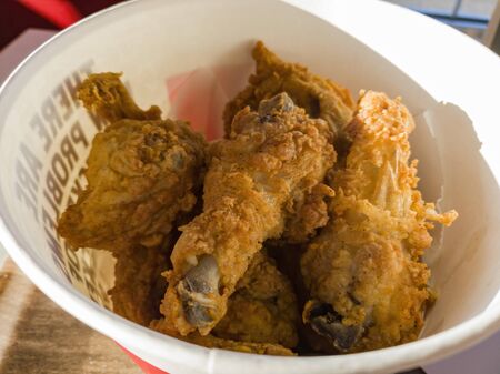 Tasty, delicious golden yellow fried chicken bucket. KFC chicken bucket.