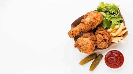 top view fried chicken drumsticks with ketchup fries with copy space. High quality photo