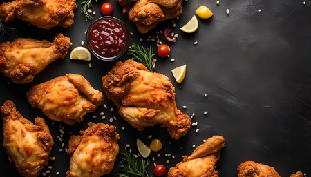 Crispy fried chicken pieces with fresh tomatoes and lemon wedges, arranged on a dark background with ketchup in a bowl.