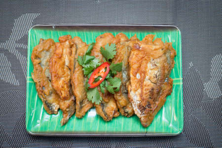 Thai food Deep fried little Tilapia fish call Pla Nil Tod in served with spicy Thai sauce