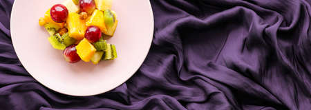 Food, drinks and diet concept - Fresh fruit vegan salad on a pink plate, healthy nutrition and detox