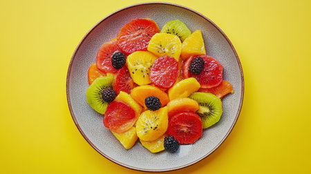 A vibrant assortment of fresh fruits elegantly arranged on a plate against a bright yellow background, representing healthy eating and fresh flavors.