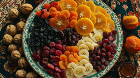 A vibrant display of dried fruits arranged on a decorative plate, showcasing a variety of flavors and colors, perfect for snacking or gatherings.