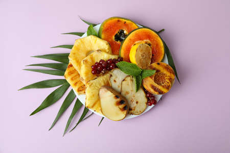 Concept of tasty food with grilled fruits on violet background.