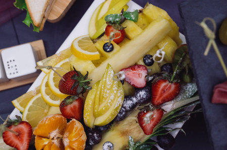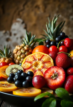 Colorful fruit platter on wooden table
