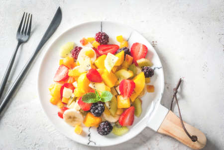 Vegan dietary food. Vitamins Summer dessert. Salad of fresh organic fruits mango, peach, apple, banana, kiwi, strawberry, blackberries. On white marble plate, white concrete table Top view copy space
