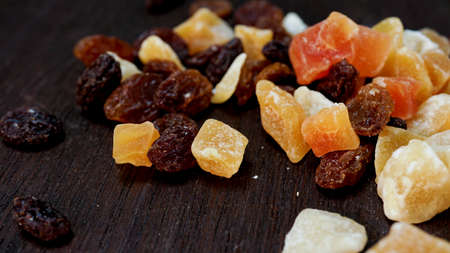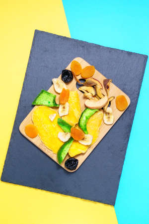 Mix of dried fruits Top view. Symbols of judaic holiday Tu Bishvat. Thanksgiving Day. Flat lay. mango, raisins, papaya, bananas, dried apricots