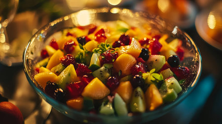 Fresh and colorful fruit salad in a glass bowl, combining juicy melons, vibrant berries, and crisp greens. Perfect for a refreshing treat. Generated A.I.