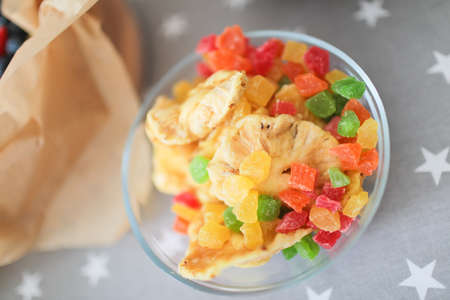 Multicolored candied fruits in a transparent stylish jar on the table. Close up.