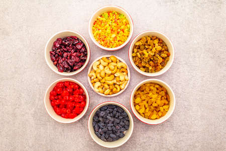 Dried and candied fruit and cashew nuts. Assorted in ceramic bowls on a stone background. Healthy vegetarian (vegan) food concept, top view