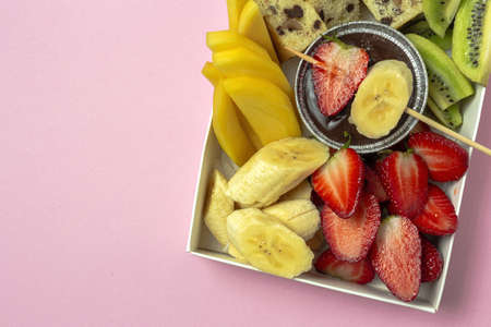 Box of fruits with chocolate ready to eat, take away. Strawberries; mango; banana; Kiwi; Biscuit. Delivery concept. Healthy food