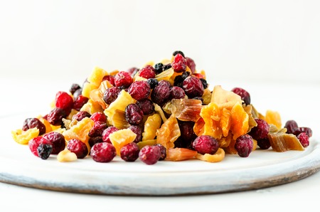 Dried fruits and berries on a wooden board on table