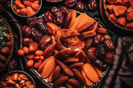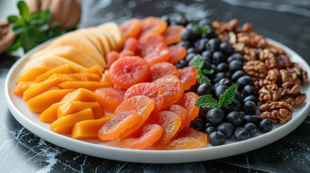 plate with vibrant dried mango slices and walnuts, showcasing delicious and healthy nuts and fruits in a colorful arrangement
