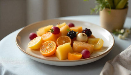 Fresh fruit plate assortment on white linen cloth