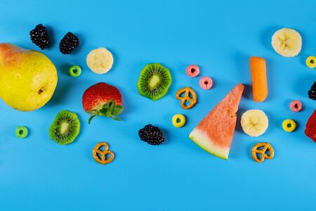 Blue background with fresh fruits and vegetables. Healty food concept.