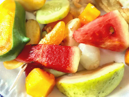 Mixed tropical exotic fruit in white dish