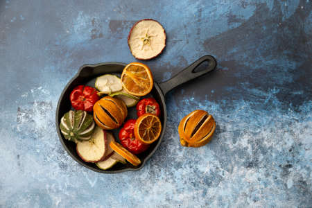 Flat lay image of dried seasonal Winter fruit on textured rough background