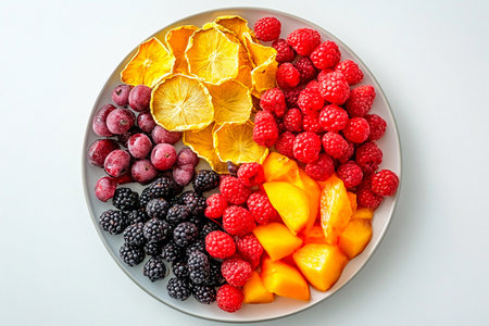 A vibrant assortment of fruits is beautifully arranged on a round plate, showcasing dried orange slices, fresh raspberries, blackberries, and juicy mango cubes, perfect for a healthy treat.