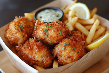 Crunchy seafood appetizer with lemon sauce on wooden plate indoors generated by artificial intelligence