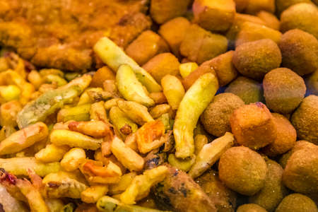 Fried snacks in paper cups on the city market, fast street food