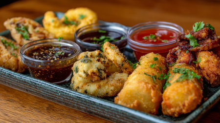 An enticing assortment of fried appetizers served on a decorative plate, accompanied by diverse dipping sauces ideal for gatherings and celebrations.