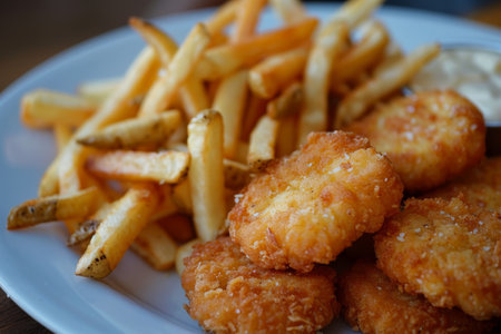 Plate of golden chicken nuggets and crispy French fries, served with ketchup, honey mustard, and a garnish of herbs