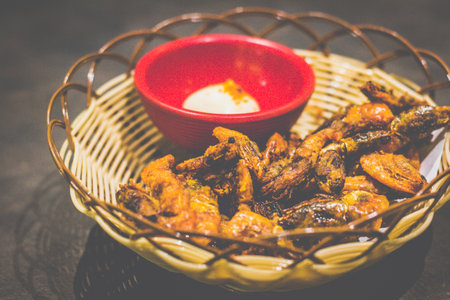 Fried chicken wings on wood background with restaurant light