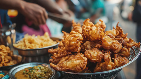 A close-up of crispy onion bhajis served with a side of chutney, freshly fried from an Indian street food stall.