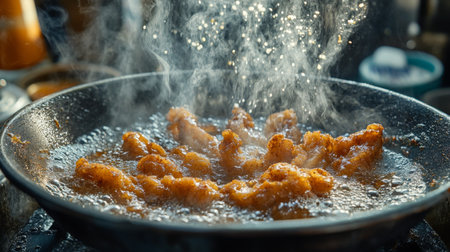 A dynamic scene of chicken pieces frying in oil, capturing the splash and steam in a kitchen setting. Perfect for culinary inspiration and cooking themes.