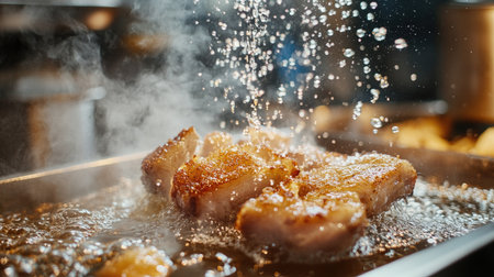 A dynamic shot of crispy pork belly being fried in hot oil, with bubbles and steam creating an enticing atmosphere in a professional kitchen.