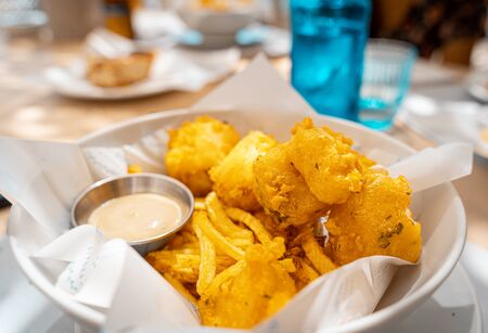 Real fish and chips with french fries ina restaurant