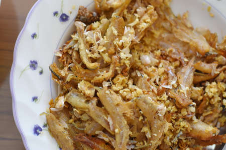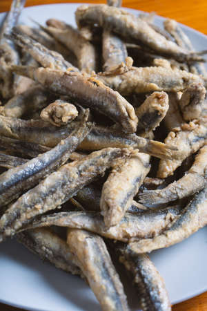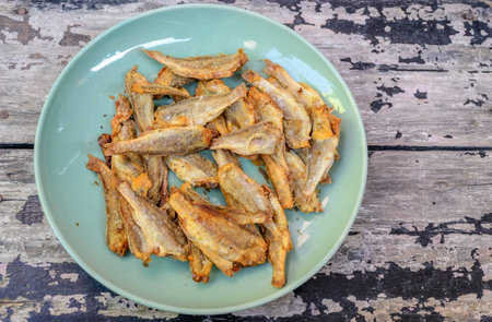 A plate of anchovy fried on a table