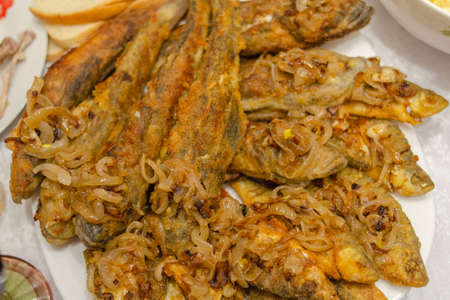 Appetizing golden fried fish with onions close-up. organic food concept