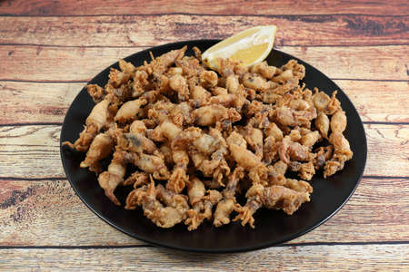 Ration of fried chopitos (squid tips) in black plate on rustic wooden table